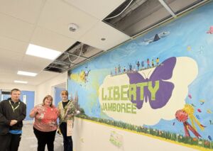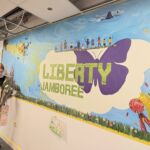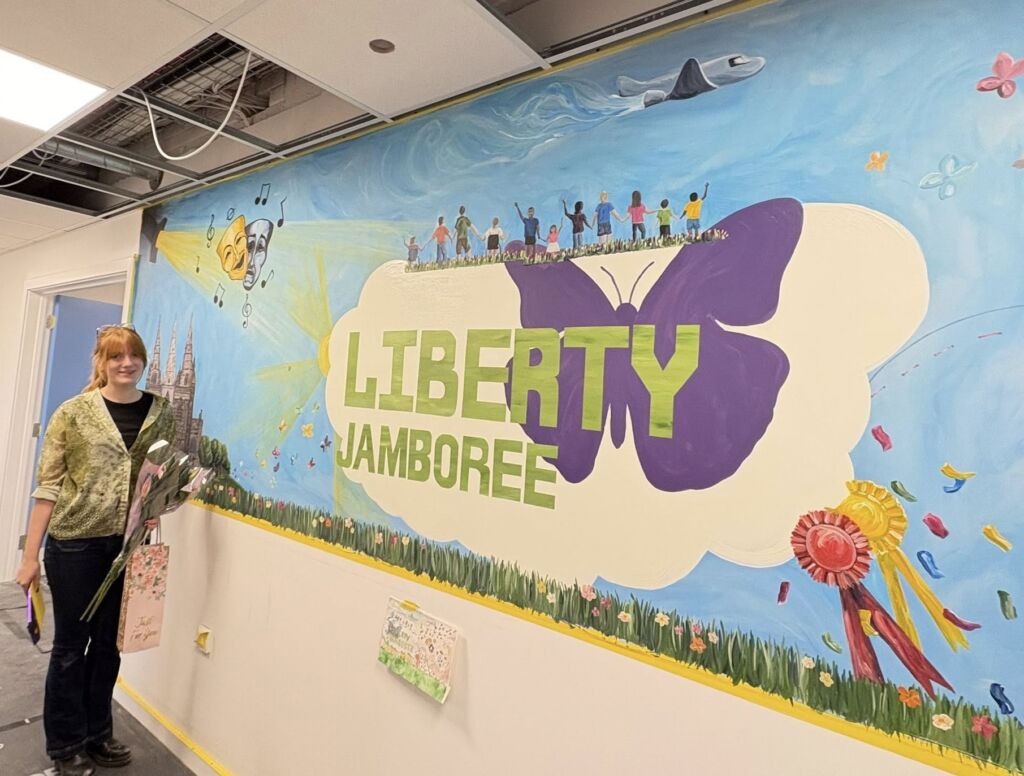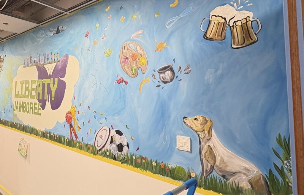 Over several weeks, Rebecca poured her creativity into transforming space at our new Liberty building – bringing to life a vibrant centrepiece that reflects everything we cherish at Liberty. From our beloved Tinker, our founder’s beloved former dog, to the inspiring individuals who’ve shaped our journey, her work captures the heart of our community.